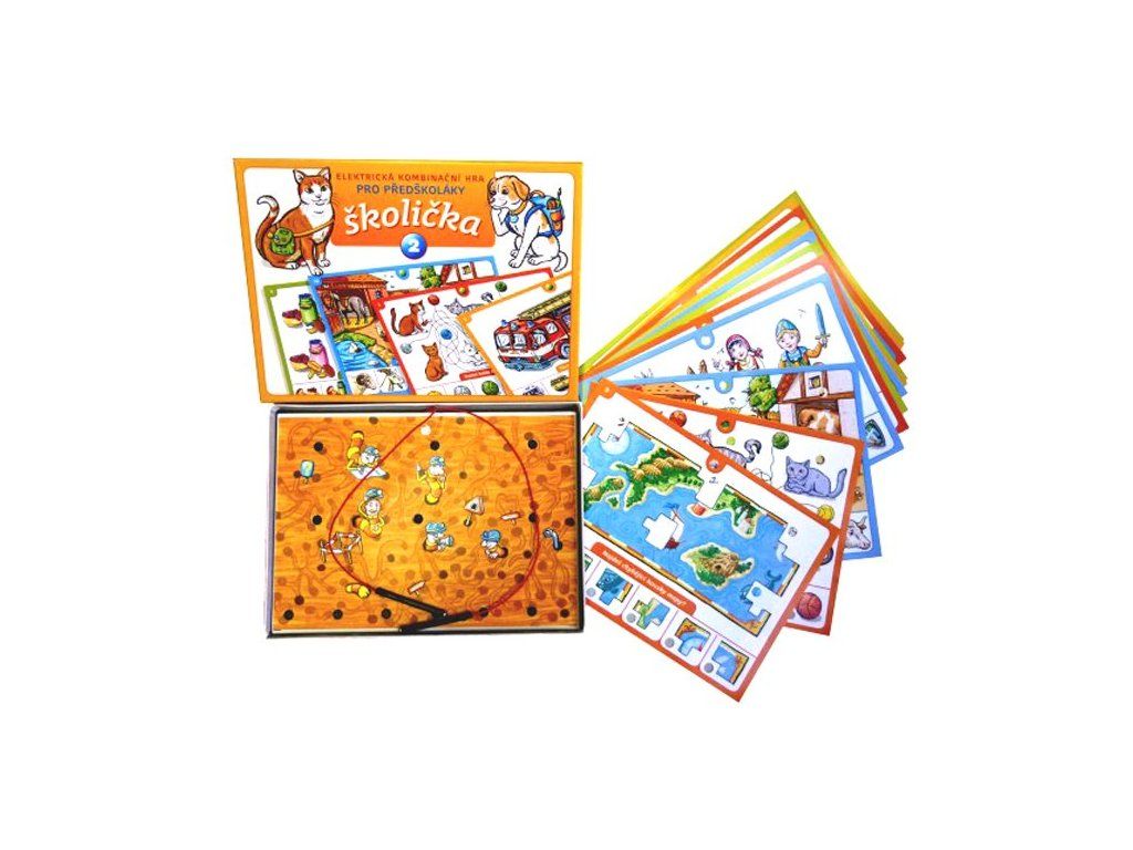 Další vydání zábavné vzdělávací hry pro děti od 4 let, která funguje na principu elektronického zkoušecího obvodu. Kombinační elektronická hra ŠKOLIČKA rozšiřuje vědomosti a slovní zásobu hravou formou. Děti zkouší přiřazovat odpovědi podle souvislostí na obrázku, aniž by musely umět číst. Krabička obsahuje 16 výměnitelných listů formátu A5 se 176 obrázky, panel s elektronikou a bateriemi. Při správné odpovědi se rozsvítí zelené světélko. Pro provoz jsou potřeba 2 x AA baterie (nejsou součástí).Dodatočné parametre