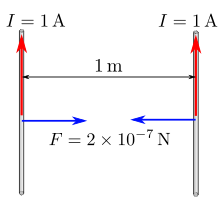 Ampérov silový zákon hovorí, že medzi dvoma vodičmi vedúcimi elektrický prúd existuje príťažlivá alebo odpudivá sila. Táto sila je použitá vo formálnej definícii ampéra: Ampér je stály elektrický prúd, ktorý pri prechode dvomi priamymi rovnobežnými nekonečne dlhými vodičmi zanedbateľného kruhového prierezu umiestnenými vo vákuu vo vzájomnej vzdialenosti 1 meter vyvolá medzi nimi stálu silu 2×10−7 newtona na 1 meter dĺžky vodiča.
