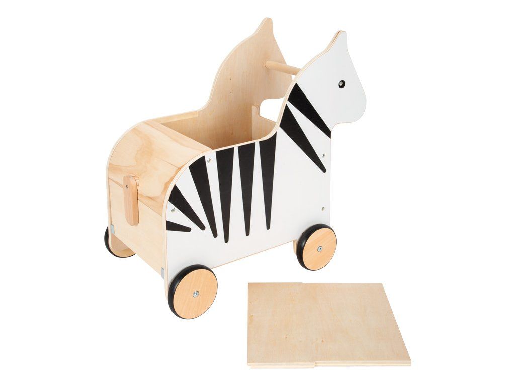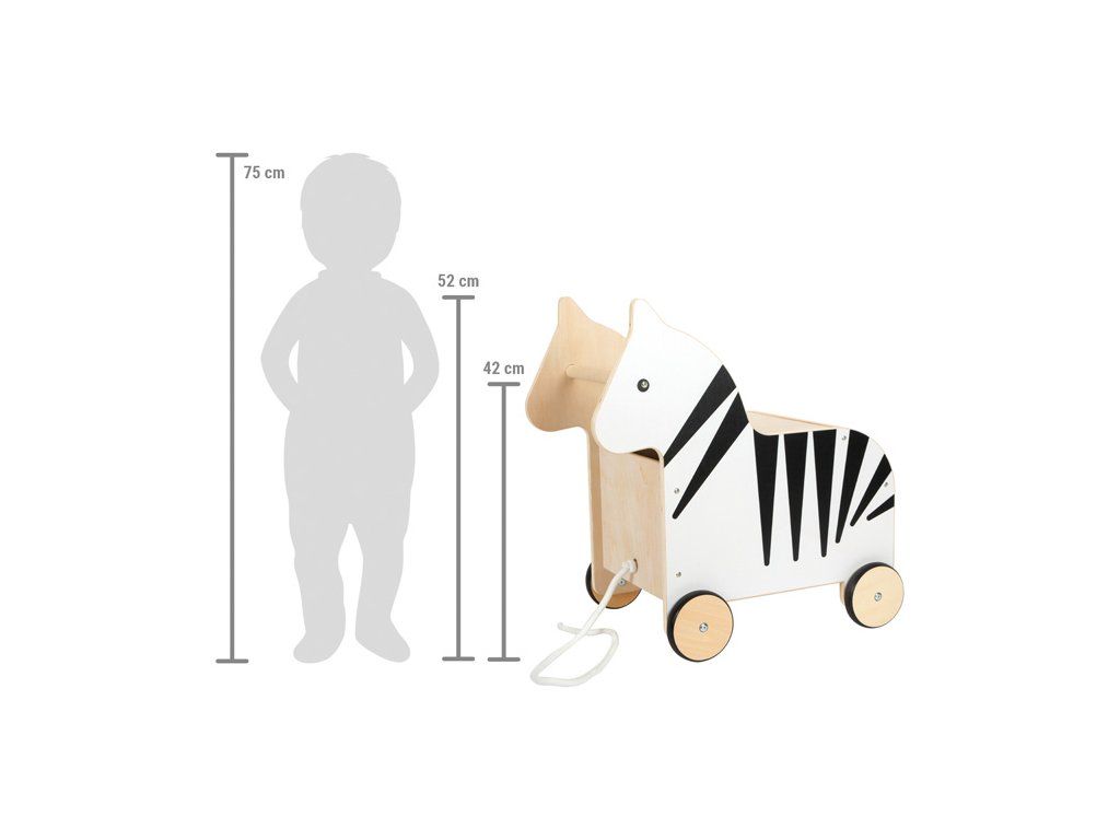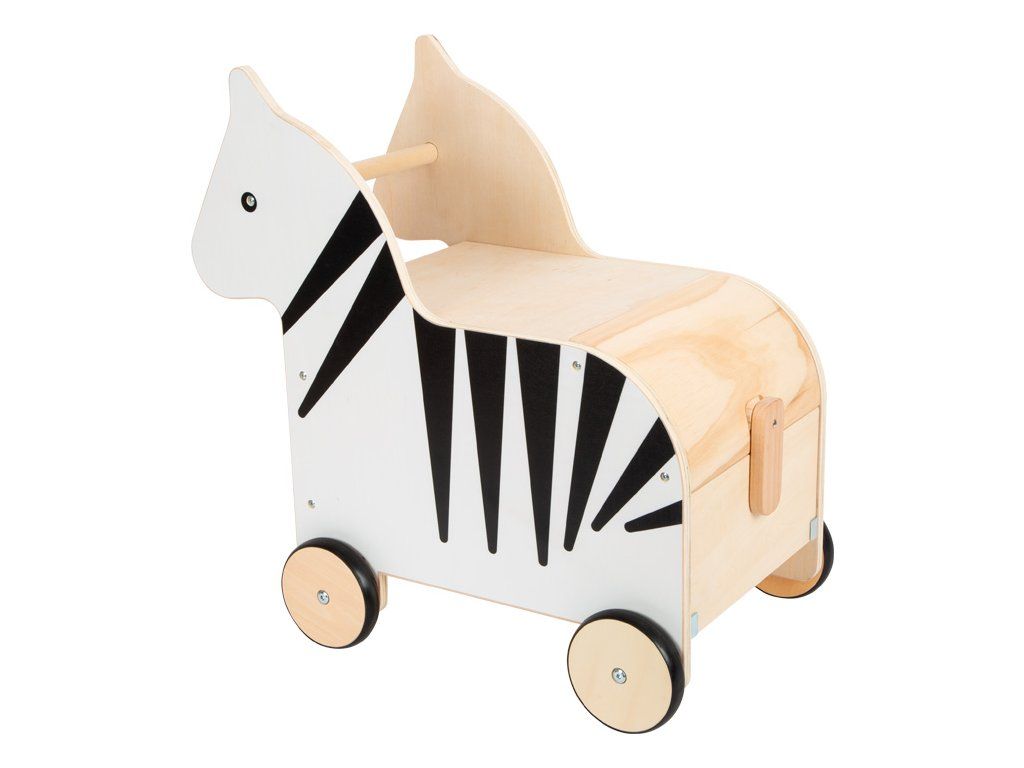 Ahoj, zebro! Tento úložný box z robustného dreva je praktickým organizérom, ktorý vo vnútri ponúka nielen veľkorysý úložný priestor pre hračky a ďalšie veci, ale aj veľa zábavy pri hraní. Dá sa tlačiť za rukoväť hlavy zebry alebo ťahať za šnúrku. Odnímateľné veko umožňuje ľahké uzavretie úložného priestoru zhora. V prednej časti je integrovaná ochrana proti privretiu prstíkov a v zadnej časti boxu na hračky má klapku, ktorá sa otvára a zatvára chvostom zebry. Zebra má pogumované kolieska pre tichú a bezpečnú jazdu. Vďaka atraktívnemu dizajnu, decentnej potlači zebry je pojazdný box na hračky praktickým a štýlovým doplnkom každej detskej izby. Hlavné vlastnosti: box je bezpečný, multifunkčnýpogumovaná kolieskaatraktívny designDodatočné parametre