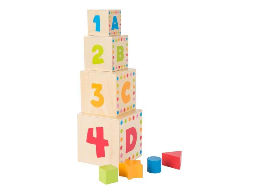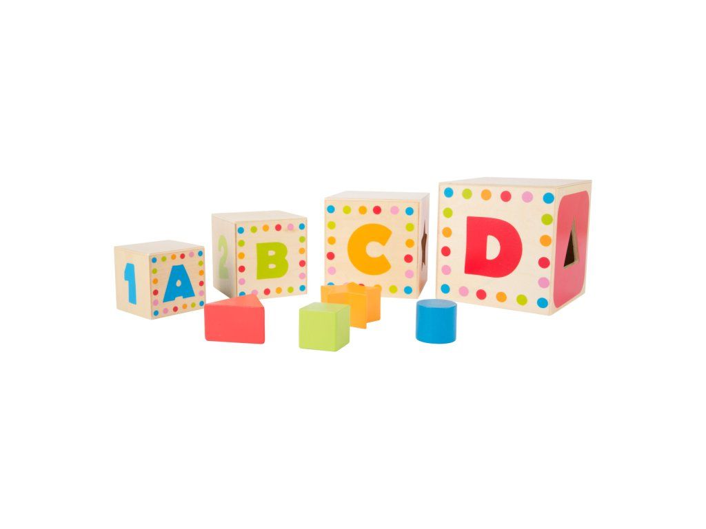 Drevené vkladacie kocky učia deti geometrickým tvarom, farbám, číslam aj písmenám. Geometrické tvary musia byť vložené cez správne otvory. Vytlačené písmená na kockách musia byť naskladané v správnom poradí, čo ponúka optimálny výukový nástroj.Upevňuje jemnú motoriku dieťaťa. Roztomilé motívy zvieratiek deti zaujmú a učenie pre nich bude veľkou zábavou. Hlavné vlastnosti: obsahuje 4 vkladacie kockyučia deti geometrickým tvarom, farbám, číslam a písmenámprecvičuje jemnú motoriku detíDodatočné parametre