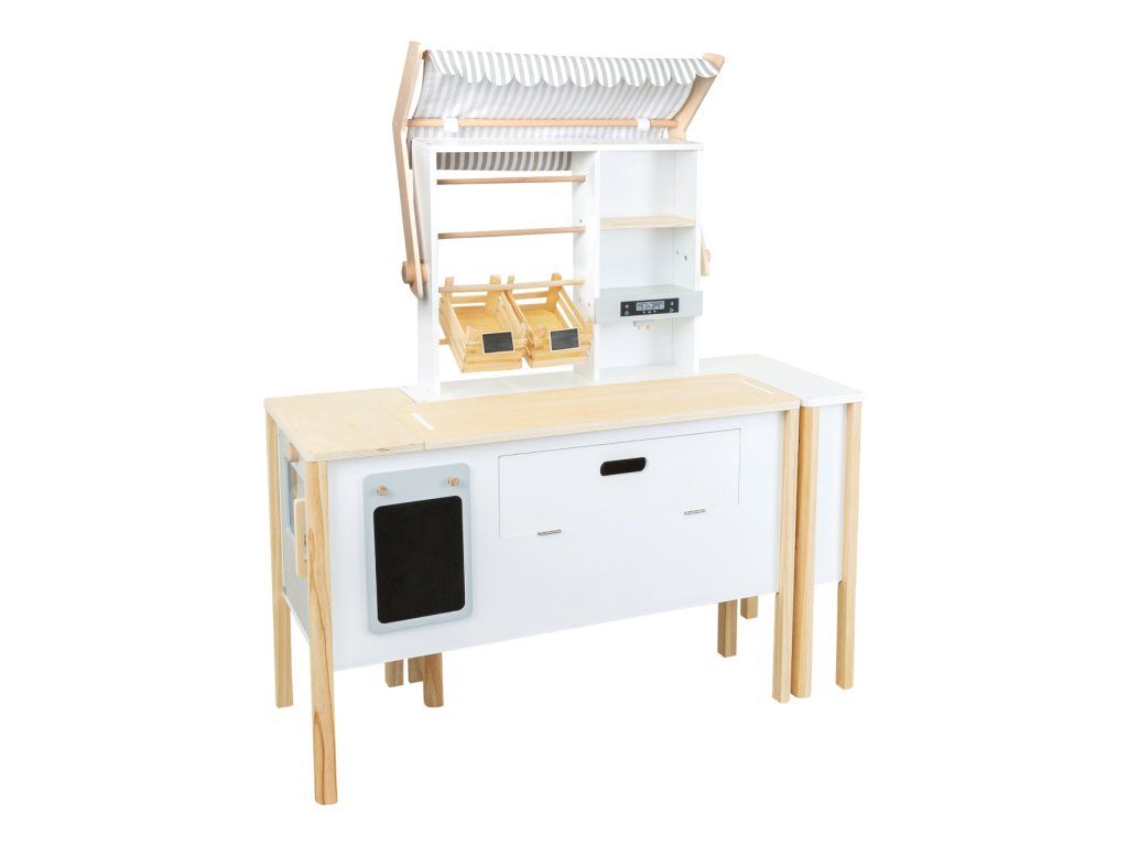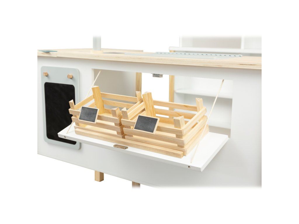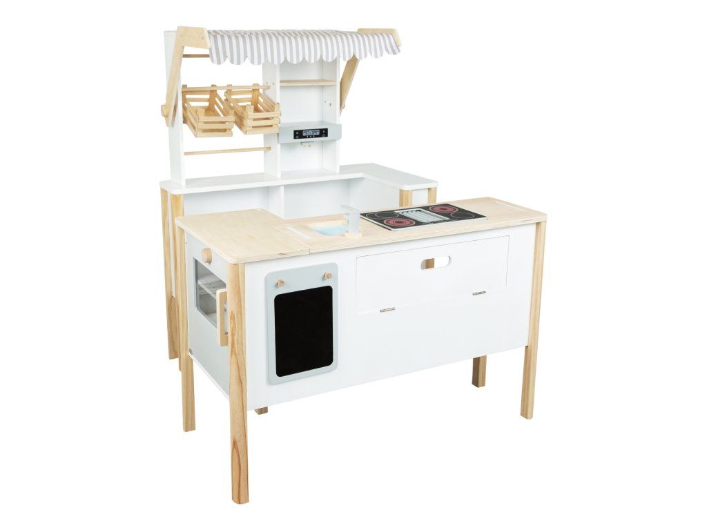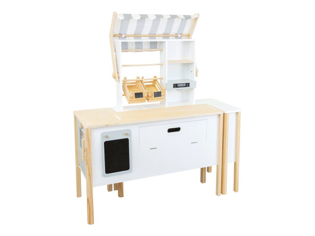 Prodejní stánek, kiosek, nebo bufet? Velký stánek v moderním skandinávském designu je modulární a multifunkční, skládá se z mnoha částí, které můžete přestavět během pár okamžiků a uspořádat i s ohledem k volnému prostoru u Vás doma. Variabilní herní prvky lze využít několika způsoby, pokladnu přestavěte na dřez, varnou desku na grill, z trouby vytvořte lednici. Ve výbavě dále naleznete váhu, výklopné police, popisovací tabule a také kávovar i úložné prostory se 2 bedýnkami. Markýza malého pultu se dá sklopit pro úsporu místa (její potah se může barevně lišit). Stánek nabízí dostatek prostoru pro hru více dětí najednou. Imitováním všedních situací se děti naučí jaké to je být prodejcem, zákazníkem, jaké je to vařit nebo jednat s lidmi. Výrobek vyžaduje montáž, dodáváno s obrázkovým návodem k sestavení. Hlavné vlastnosti:multifunkčné, rôznorodé využitiemodulárna konštrukcia s variabilným vybavenímrozvíja komunikačné a sociálne zručnosti detíDodatočné parametre
