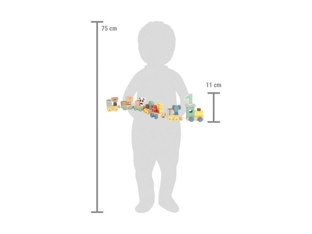 Vyčarujte malým deťom úsmev na tvári týmto narodeninovým vláčikom, ktorého pasažieri sú zvieratká z džungle. S láskou navrhnuté zvieratká privážajú narodeninové sviečky na svojich vagónoch. Deti si môžu ľubovoľne umiestňovať 6 zvieratiek na 6 vagónov. Do lokomotívy deti môžu vkladať číslice od 1 po 9. Vagóny je možné ľahko spojiť či odpojiť pomocou malých háčikov a očiek. Navyše sa so zvieratkami dajú vymýšľať ďalšie hry, keď vystúpia z vlaku. Alebo sa môžu deti hrať len tak a vymýšľať svoje vlastné príbehy. Hračka je ideálna pre deti od 24 mesiacov. Vďaka vysokému množstvu prírodného dreva v kombinácii s modernými farbami je tento narodeninový vlak skutočným lákadlom a príjemnou dekoráciou na každom narodeninovom stole. Balenie obsahuje: 6 zvieratiek, 6 vagónikov, lokomotíva s číslami od 1 do 9 Hlavné vlastnosti: roztomilá narodeninová dekoráciapodporuje predstavivosťDodatočné parametre