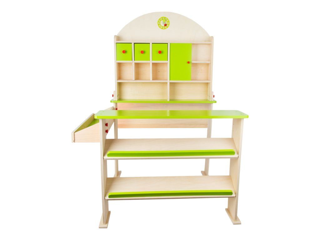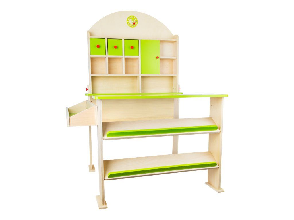 Podporte svoje deti v poznávaní spoločenských zvyklostí a rozvíjaní komunikačných i početných zručností pomocou moderného predajného stánku. Jeho základom je priestranný pult, na ktorý je možné pohodlne umiestniť rad doplnkového príslušenstva, napríklad pokladňu, váhu a krájacie dosky. Šikmé policové diely sú obzvlášť vhodné na ukladanie rozmanitých debničiek. Pre jednotlivé makety a tovar je možné využiť ďalšiu samostatnú policu. Zadná stena obchodu ponúka niekoľko rôznych odkladacích plôch a skriniek opatrených funkčnými dvierkami. Jej štít navyše zdobia jednoduché hodiny, na ktorých je možné vyznačiť otváraciu dobu. Všetky súčasti sú vyrobené z veľmi odolnej preglejky a vďaka praktickej, rozoberateľnej konštrukcii využívajúcej robustné krídlové matice je možné stánok ľahko upratať tak, aby šetril miestom. Výrobok vyžaduje montáž, dodávané s obrázkovým návodom na zostavenie. Hlavné vlastnosti:veľké množstvo rozmanitých úložných priestorov4 dielna, ľahko rozoberateľná konštrukciarobustné a odolné drevené prevedenieDodatočné parametre