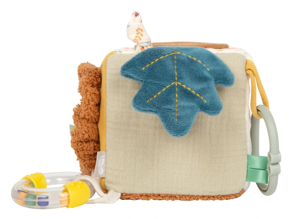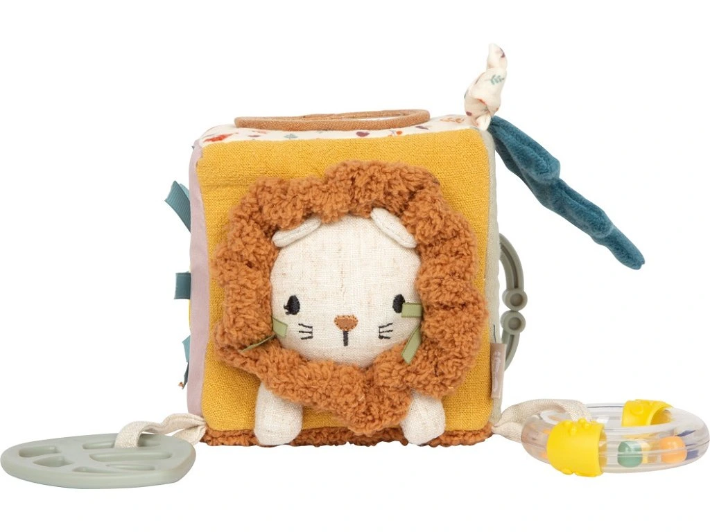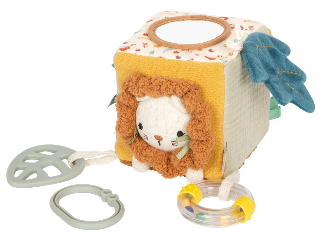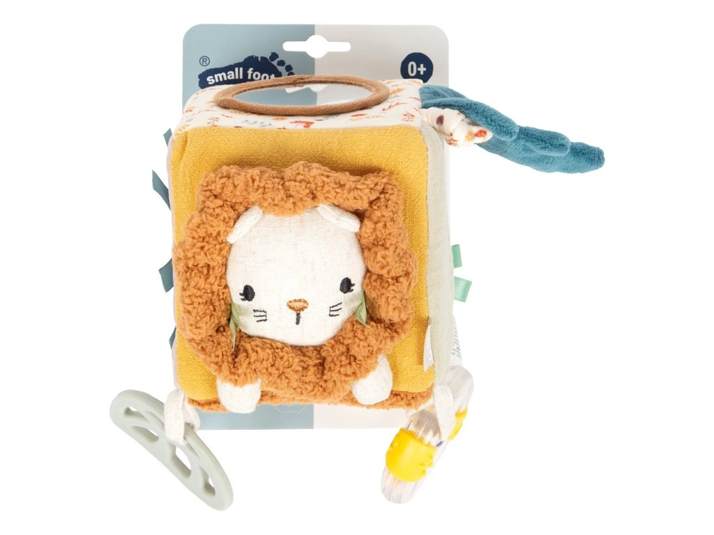 Dotýkaj sa, počúvaj, objavuj!Táto mäkká hracia kocka je všestrannou hračkou pre bábätká, ktorá ponúka množstvo podnetov k hre i objavovaniu. Šuštiace prvky, zabudovaný zvonček, hrkálka aj hryzátko vytvárajú rozmanité zvuky a hravou formou podporujú raný vývoj dieťaťa. Rôznorodé textúry látok stimulujú hmat, zatiaľ čo uchopovanie, stláčanie a otáčanie jednotlivých strán kocky prirodzene rozvíja jemnú motoriku. Vďaka praktickému pútku je možné kocku ľahko pripevniť na kočík, autosedačku alebo hrazdičku, takže je vždy po ruke. Kompaktný a mäkko polstrovaný tvar robí kocku bezpečnú a príjemnú na maznanie aj pre tých najmenších. Veselý motív levíčka, roztomilý dizajn a harmonické farby z nej robia obľúbenú hračku každého bábätka. Skvele sa hodí ako doplnok k ďalším produktom z kolekcie Little Lion a je ideálnym darčekom k narodeniu dieťaťa alebo ku krstu. Hlavné vlastnosti: multifunkčná látková hracia kocka s veselým motívom levíčkakaždá strana ponúka iné prvky – napr. zvonček, hrkálka alebo hryzátkobezpečná pre malé detské ručičkypodporuje zmysly – predovšetkým sluch, hmat a úchoprozvíja jemnú motoriku hravou formoumäkké a príjemné prevedenie ideálne na maznaniepraktické pútko pre ľahké pripevnenie na kočík, autosedačku a pod.vhodná od narodeniaDodatočné parametre