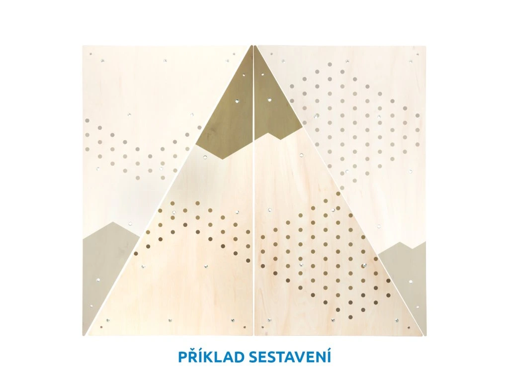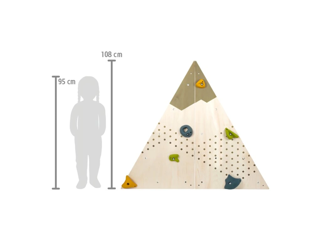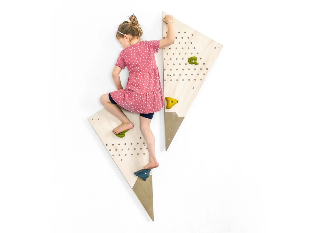 Modulárna lezecká stena do detskej izby! Skladá sa z 2 trojuholníkov, každý z nich má 9 predvŕtaných otvorov, do ktorých padne 6 robustných plastových chytov, ktoré nájdete v balení. Chyty môžete umiestniť kam chcete, v akomkoľvek uhle, ktorý je vhodný vzhľadom na schopnosti detí. Na inštaláciu nepotrebujete náradie, hračka je vybavená aj ochranou steny.S touto lezeckou stenou si deti užijú mnoho zábavy. Lezecké chyty sú pre deti dobre uchopiteľné, dajú sa premiestniť bez toho, aby ste museli stenu rozmontovať, otvory sú totiž závitové. Kompatibilné s lezeckými chytmi Adventure a ďalšími produktmi z tohto radu. Trénovanie motoriky zábavným spôsobom! Hlavné vlastnosti: modulárna horolezecká stena s 2 trojuholníkmi a 18 otvormišesť plastových chytov vhodných pre detiochrana múru z druhej strany stenychyty je možné jednoducho rotovaťkompatibilný s lezeckými chytmi Adventure a ďalšími produktmi z tohto raduDodatočné parametre