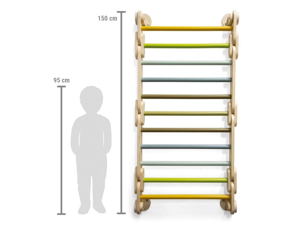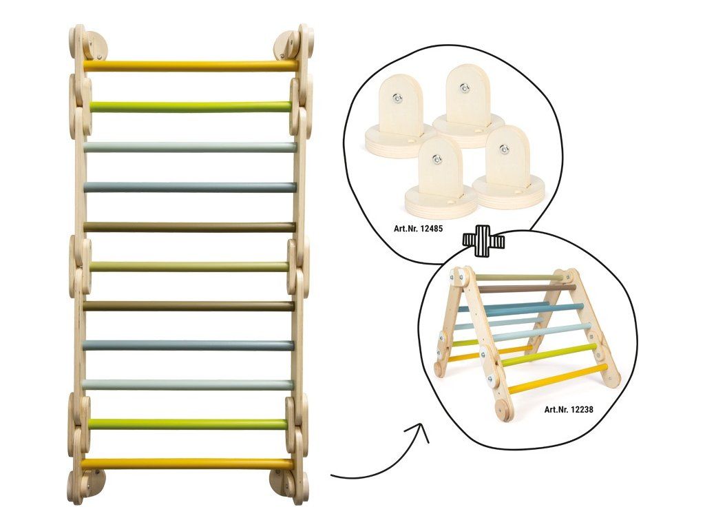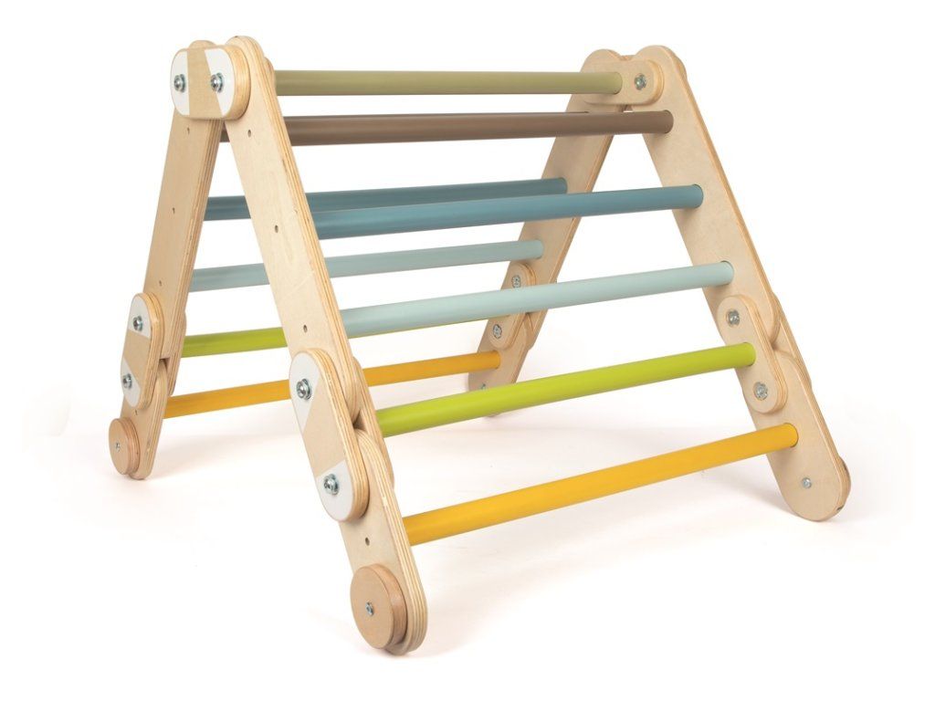 Lezecký trojuholník a rebriny 2 v 1 vynikajú svojou flexibilnou konštrukciou. Lezecký trojuholník voľne stojaci na zemi môže slúžiť ako zábavná preliezačka, zakrytá dekou ako skrýša či domček. Pokiaľ nemáte dostatok miesta, je možné ho rozložiť a pomocou 4 úchytov (ktoré sú súčasťou balenia) upevniť na stenu a vytvoriť tak rebriny s 11 tyčami vhodné aj pre staršie deti. Deti môžu rozvíjať svoje motorické zručnosti, rovnováhu a koordináciu pohybov. Rebriny je možné tiež využiť na pohybovú terapiu. Skvele doplní každú izbu alebo herný kútik a je možné ich kombinovať s ďalšími produktmi radu Adventure. Výrobok vyžaduje montáž, dodávané s detailným návodom na zostavenie. Hlavné vlastnosti: multifunkčné použitiepre mladšie aj staršie detiodolné drevené prevedenienosnosť 50 kgDodatočné parametre