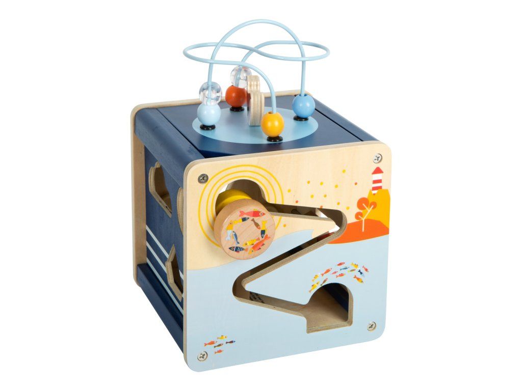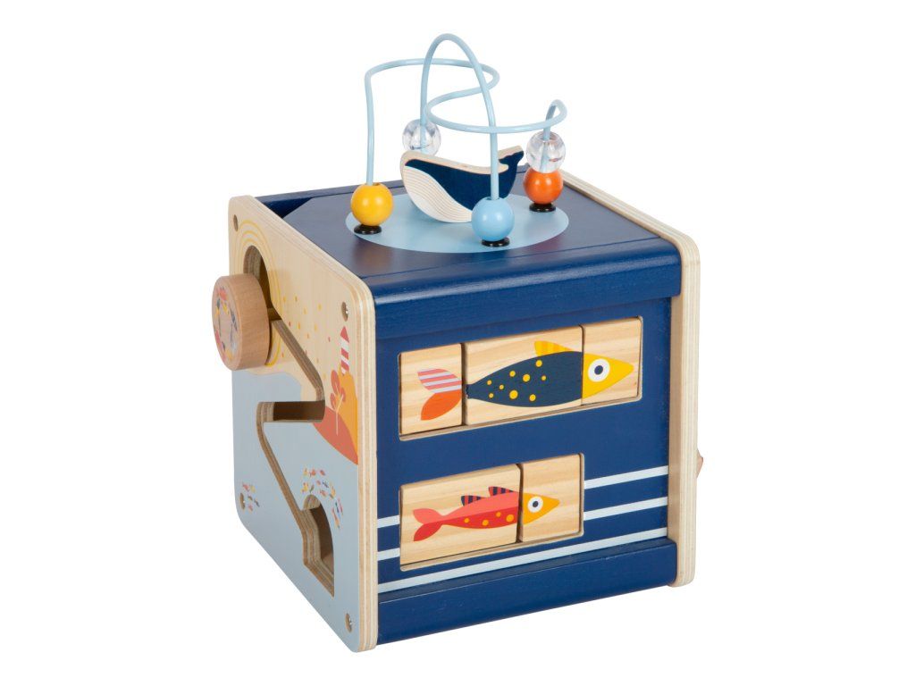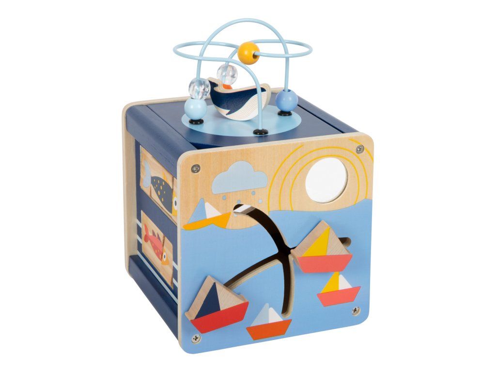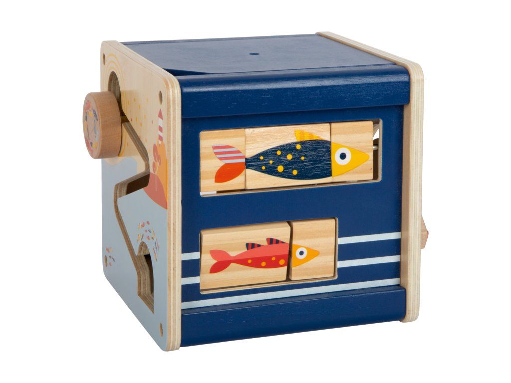 Dva korálkové labyrinty, vkladačka, posuvné bludisko a otočné štvorce na piatich stranách. Motorická kocka v tematike oceánu je vyrobená z pevného dreva a čo sa týka zábavy, hry, učenia a objavovania, je naozaj všestranná. Má moderné farby, mnoho prírodného dreva, trénuje porozumenie farbám a tvarom, pomáha s rozvojom zručnosti a jemnej motoriky, zlepšuje koordináciu ruka-oko a inšpiruje k predstavivej hre. Sýte kontrastné farby a zrkadlo stimulujú zrak detí. Oddeliteľné veko je možné uložiť do kocky, ušetríte tak miesto.Chcete si precvičiť motoriku? S touto kockou to bude hračka! Veselí obyvatelia oceánu deti nadchnú k predstavivej hre. Moderná farebná schéma a mnoho prírodného dreva, bude sa hodiť do každej detskej izby. Vodné živočíchy deti odprevadí na ceste za dobrodružstvom a prebudia ich zvedavosť. Kocka má zaoblené hrany. Hlavné vlastnosti: stabilná motorická kockapäť strán plných hrykorálkový labyrint, vkladačka, posuvné bludisko, otočné štvorcekvalitné ilustrácie, moderná farebná schéma, mnoho prírodného drevaoddeliteľné veko je možné uložiť do kocky, ušetríte tak miestomotívy oceánupríjemná haptika vďaka zaobleným hranámpomáha s rozoznávaním farieb a tvarov, trénuje zručnosť a jemnú motoriku, zlepšuje koordináciu ruka-okoDodatočné parametre