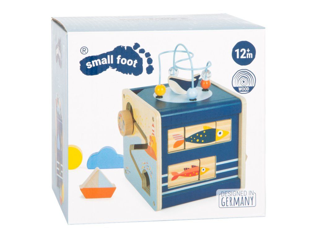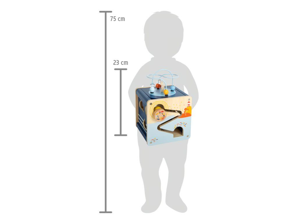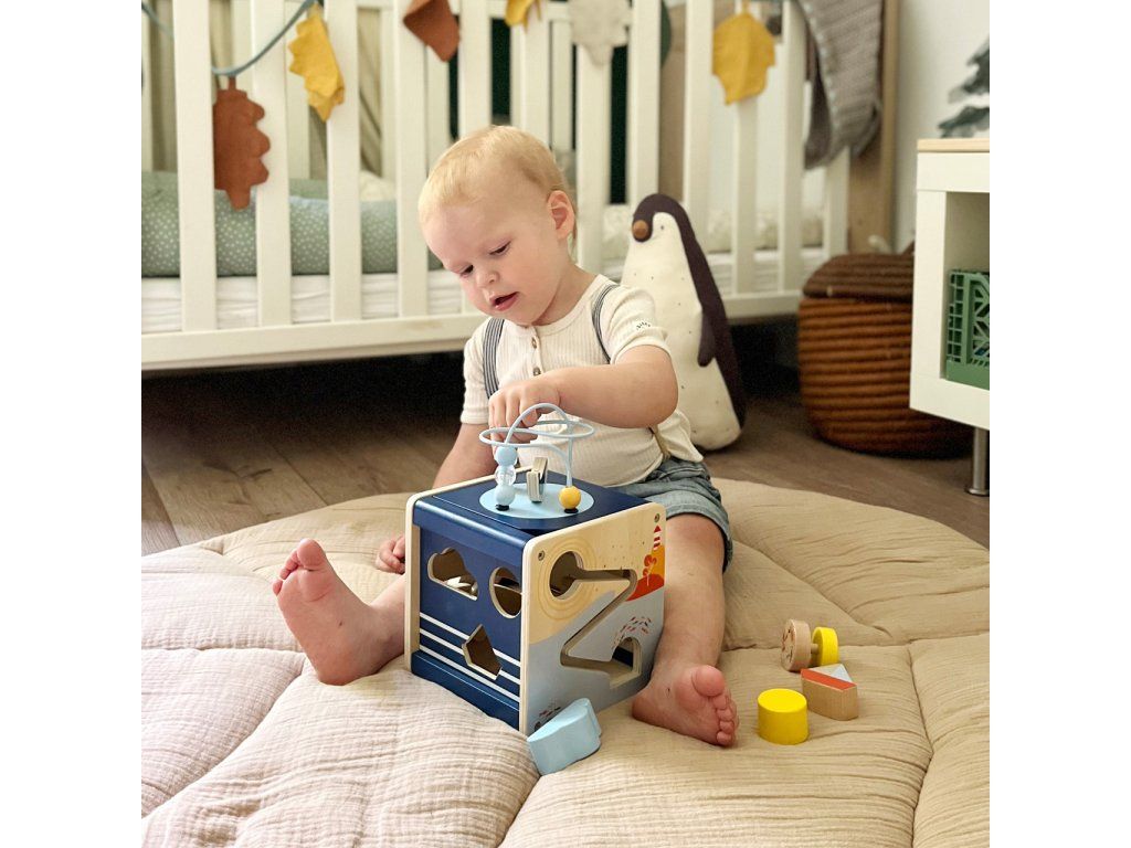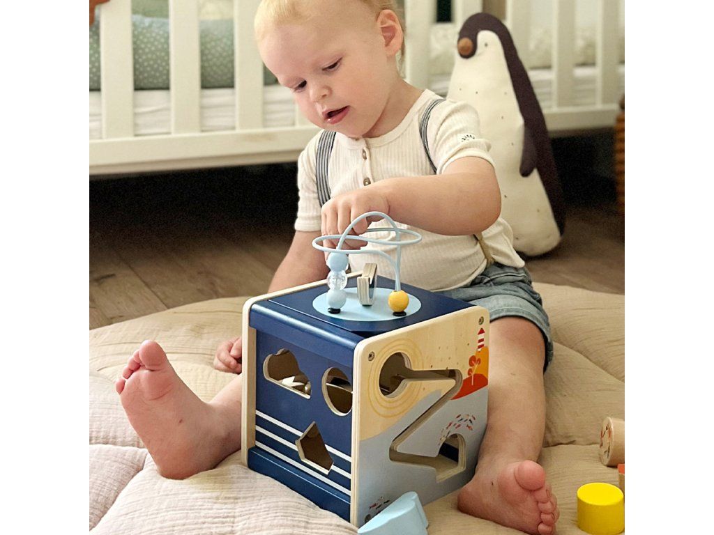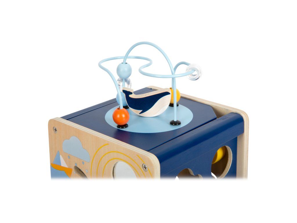 Dva korálkové labyrinty, vkladačka, posuvné bludisko a otočné štvorce na piatich stranách. Motorická kocka v tematike oceánu je vyrobená z pevného dreva a čo sa týka zábavy, hry, učenia a objavovania, je naozaj všestranná. Má moderné farby, mnoho prírodného dreva, trénuje porozumenie farbám a tvarom, pomáha s rozvojom zručnosti a jemnej motoriky, zlepšuje koordináciu ruka-oko a inšpiruje k predstavivej hre. Sýte kontrastné farby a zrkadlo stimulujú zrak detí. Oddeliteľné veko je možné uložiť do kocky, ušetríte tak miesto.Chcete si precvičiť motoriku? S touto kockou to bude hračka! Veselí obyvatelia oceánu deti nadchnú k predstavivej hre. Moderná farebná schéma a mnoho prírodného dreva, bude sa hodiť do každej detskej izby. Vodné živočíchy deti odprevadí na ceste za dobrodružstvom a prebudia ich zvedavosť. Kocka má zaoblené hrany. Hlavné vlastnosti: stabilná motorická kockapäť strán plných hrykorálkový labyrint, vkladačka, posuvné bludisko, otočné štvorcekvalitné ilustrácie, moderná farebná schéma, mnoho prírodného drevaoddeliteľné veko je možné uložiť do kocky, ušetríte tak miestomotívy oceánupríjemná haptika vďaka zaobleným hranámpomáha s rozoznávaním farieb a tvarov, trénuje zručnosť a jemnú motoriku, zlepšuje koordináciu ruka-okoDodatočné parametre