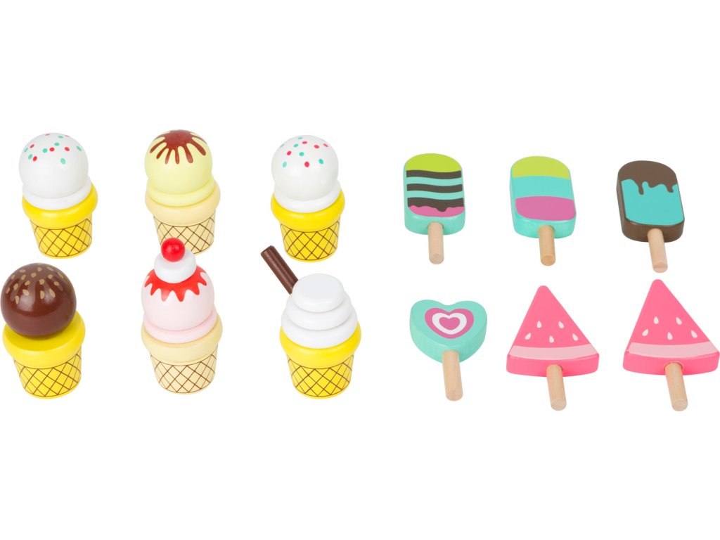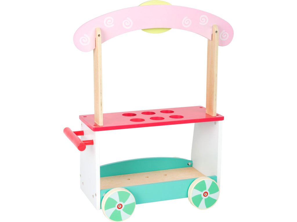Pojazdný drevený zmrzlinový vozík je tu! Vďaka štyrom kolieskam a madlu ho možno pohodlne tlačiť k ďalšiemu zákazníkovi. Ponúkame 6 druhov zmrzlín vo vaflovom kornúte a 6 nanukov na drevenej tyčinke! Kornútky sú opatrené kolíkom, na ktorý kopčeky nasadzujeme a vzájomne ich kombinujeme. Vozík je využiteľný i ako stánok na trhu. Hlavné vlastnosti: 12 druhov zmrzlín má v stánku vyhradené svoje miestoje možné použiť na predaj iných výrobkov či rozšíriť sortimentspodná polica ponúka priestor na uloženie ďalších hračiekpodporuje kreatívne hranie rolí a rozvíja sociálne zručnostiDodatočné parametre