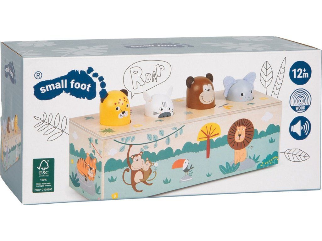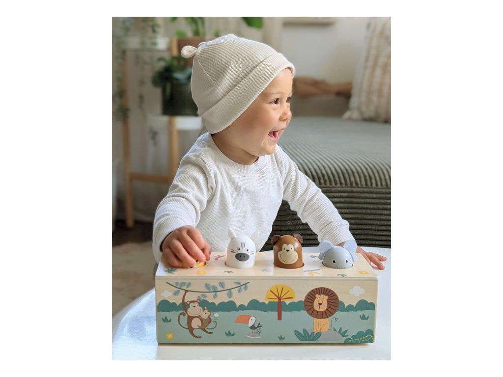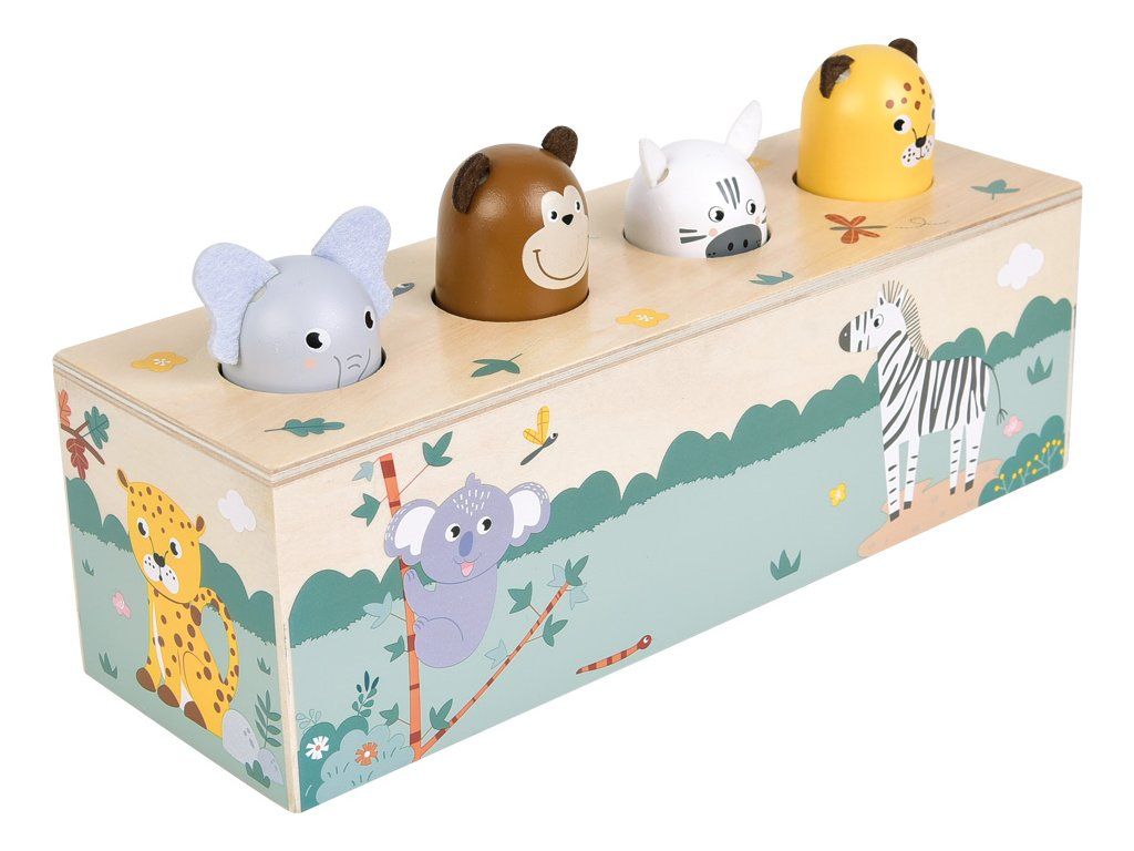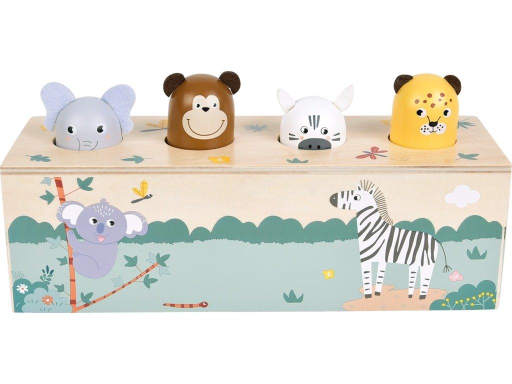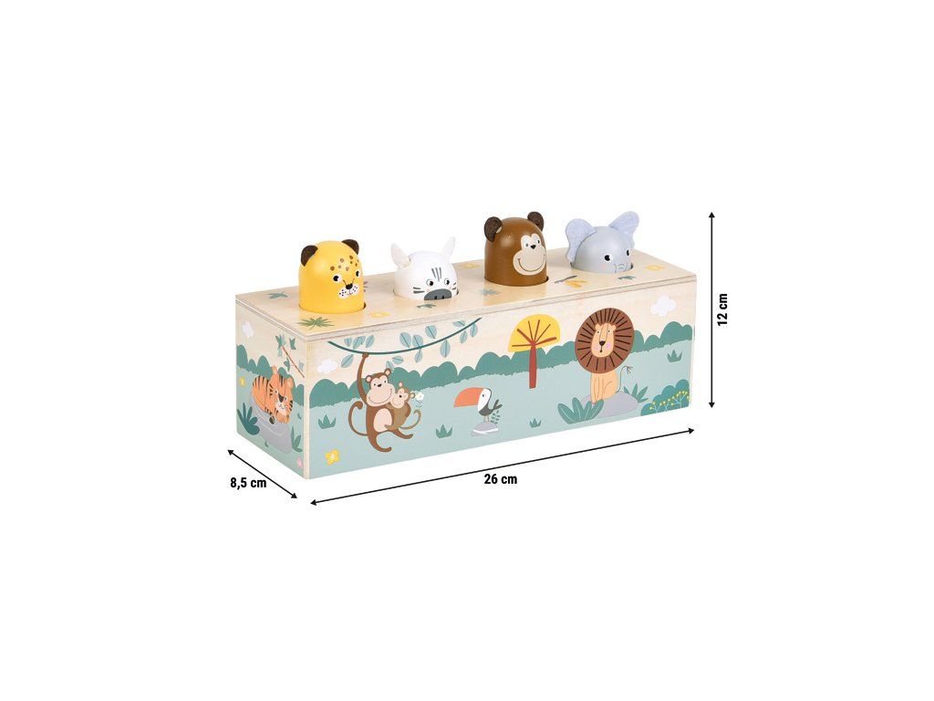 Táto interaktívna drevená hračka z FSC® 100% certifikovaného dreva rozhýbe štyri obľúbené zvieratká zo safari a navyše vydáva reálne zvieracie zvuky! Stačí stlačiť jedno zvieratko a ozve sa jeho typický zvuk. Deti sa tak hravou formou učia poznávať hlasy zvierat a zároveň objavujú princíp príčiny a následku. Štyri detailne spracované hlavičky – slon, opice, zebra a leopard prekvapia deti veselým pohybom a autentickým zvukom pri jemnom stlačení. Vďaka robustnému drevenému spracovaniu, deťom prívetivým ilustráciám a moderným safari dizajnom je hračka nielen krásna, ale aj odolná a trvanlivá. Hravý spôsob, ako deti učiť nové zručnosti, podporovať ich zvedavosť a pritom sa skvele baviť! Hlavné vlastnosti: z FSC® certifikovaného drevanapájanie na batériezvuková hračkarozvíja jemnú motoriku, sluchové vnímanie, pozornosť a logické mysleniepomáha k porozumeniu súvislostiam medzi akciou a reakcioubatérie 2xAAA 1,5 V - nie sú súčasťou balenia Značka a certifikát FSC® (Forest Stewardship Council) zaručuje, že drevo, z ktorého bol výrobok vyrobený, nebolo vyťažené nelegálne a pochádza z lesov obhospodarovaných šetrným či prírode blízkym spôsobom, v ktorom sú dodržiavané prísne environmentálne a sociálne požiadavky. Značka FSC® na výrobku znamená, že svojim nákupom pomáhate chrániť lesy a podporujete šetrné, zodpovedné či prírode blízke hospodárenie, vďaka ktorému sú naše lesy stabilnejšie, zdravšie, majú prirodzenú druhovú skladbu a lepšie odolávajú negatívnym následkom klimatických zmien.Dodatočné parametre