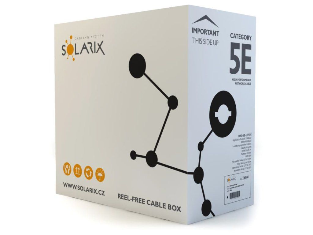 Tieto káble bez problémov spĺňajú požiadavky definované v medzinárodných štandardoch ANSI / TIA / EIA 568, ISO / IEC 11801 a EN 50173 pre kategóriu 5E a sú vhodné aj pre prenos dát rýchlosťou až 1 Gb / s (tj. Gigabitový Ethernet). Rovnako ako ostatné káble Solarix, je aj kábel SXKD-5E-UTP-PE značený metráží po 1m v rozsahu od 0 do 305m. Kábel je dodávaný vo vysoko odolnom trojvrstvovom leštenom kartónovom boxe (vždy farebne jednoznačnom podľa typu kábla), na ktorom sú uvedené všetky nevyhnutné produktové informácie vrátane čiarových kódov, výrobné šarže, popisu a najdôležitejších technických parametrov (napr. NVP v podobe QR kódu). Pri inštalácii do zeme odporúčame vždy použiť HDPE chráničku.