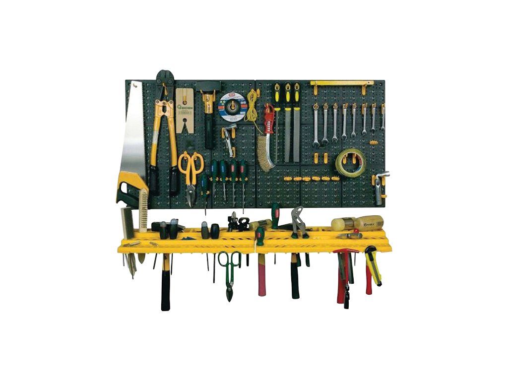 Stena na náradie TIPA O3682× panel, 50 plastových úchytů, 2× zásuvný držák na nářadí. K upevnění na svislou podložku nebo zeď, bez upevňovacích šroubů, rozměry panelů 1000×500mm+držák