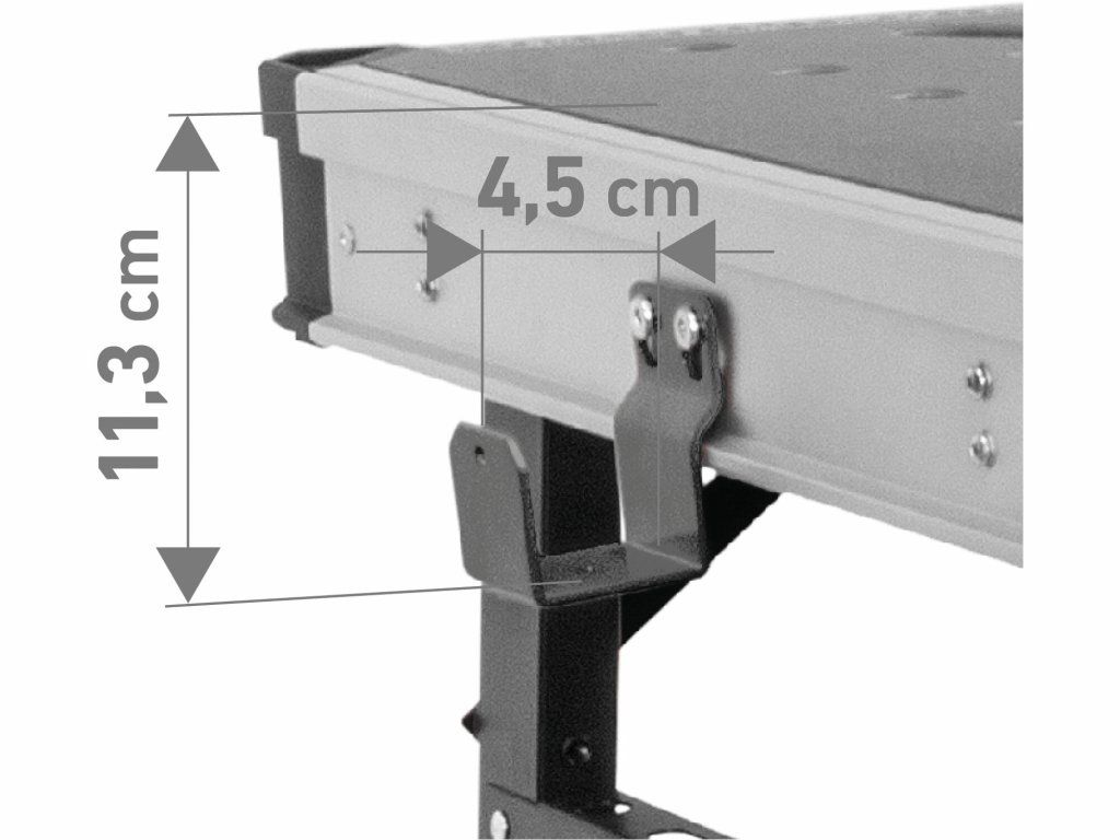 - stôl je možné pomocou dvoch bočných úchytov spojiť s ďalším stolom alebo medzi ne na dvojicu drevených profilov nainštalovať ľubovoľne dlhú pracovnú dosku