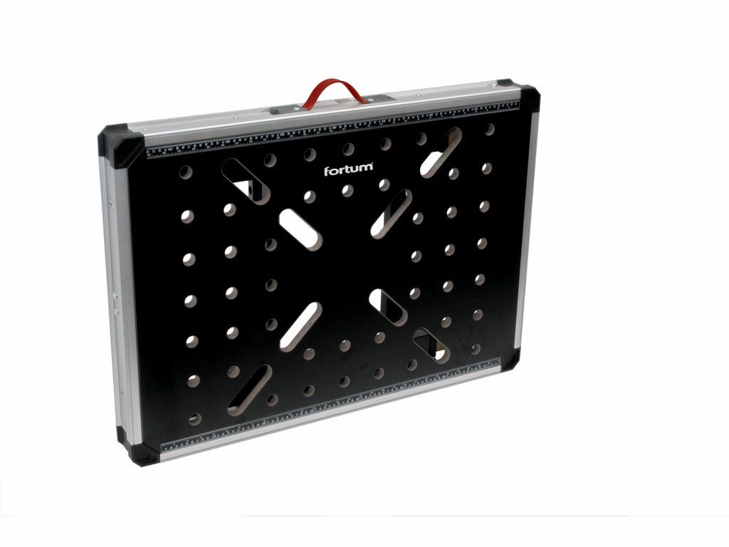 - pevná kovová konštrukcia s MDF doskou zasadenou do hliníkového rámu s množstvom výrezov pre použitie upínacích svoriek alebo dodávaných zarážok