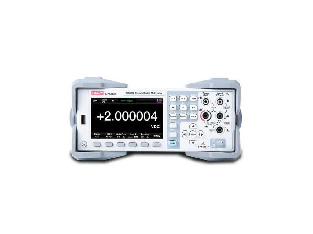 UT8806E je stolný digitálny multimeter s maximálnou zobraziteľnou hodnotou 2 000 000 s automatickým alebo voliteľne manuálnym nastavením rozsahov, farebným displejom a funkciou merania skutočnej hodnoty RMS. Vyznačuje sa vysokou presnosťou, multifunkčnosťou a plnou automatizáciou. UT8806E je vybavený 4,3-palcovým TFT displejom s rozlíšením 480 x 272, podporuje prevádzku s LAN, USB, RS-232C a GPIB (voliteľné) a je vhodný pre vysoko presné merania v laboratóriách a automatizovaných testovacích systémoch, vývoj kontrola a údržba.
