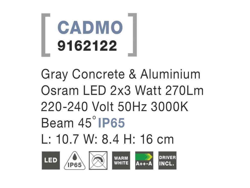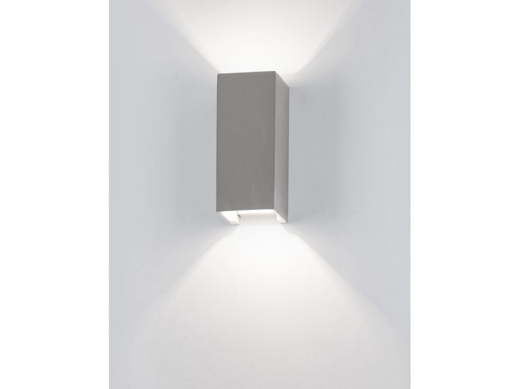 Dizajnové nástenné vonkajšie svietidlo Cadmo S v tvare hranola je vyrobené z hliníka v kombinácii so šedým betónom. Toto prevedenie je perfektné pre osvetlenie záhrad, balkónov, terás a ďalších priestorov okolo domu. Svojim vzhľadom ale ľahko doplní aj akýkoľvek interiér. Dve integrované LED žiarovky vytvárajú vďaka dômyselnej konštrukcii úžasný efekt trubicového svetla. To znamená, že vytvárajú svetelný kužeľ ako smerom dole, tak i hore.