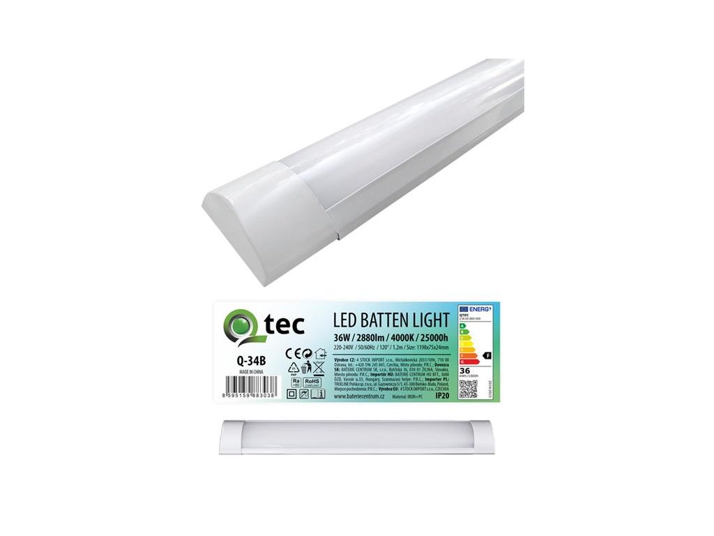 LED podlinkové energeticky úsporné svietidlo 36W 2880lm Batten Light Q-34B Qtec. Vyžaruje príjemnú neutrálnu bielu farbu svetla 4000K. Svietidlo má široké, praktické využitie je možné namontovať do interiéru napr. nad kuchynskú linku, do chodieb, hál, kancelárií, do jedálne, kaviarne, obchodu, dielne, garáže a pod.