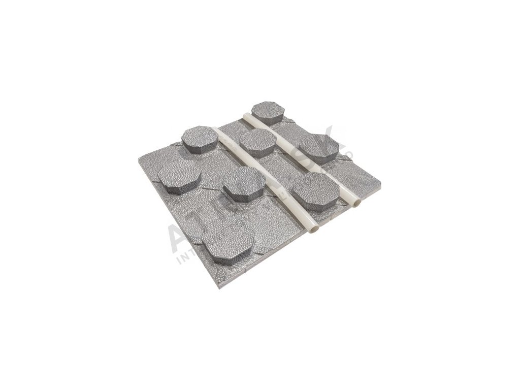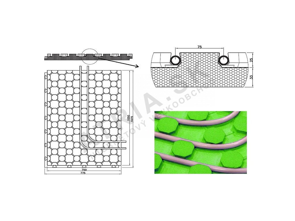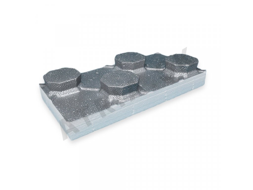 NOVINKA na trhu, PE fólie s hliníkovým práškem - polystyrenová izolační deska STIROTERMAL BASIC. Nová a vylepšená původní zelená deska UHP55. Zajišťuje lepší rozvod tepla, lepší průnik betonovou deskou, a tím i nižší náklady na vytápění. Systémová polystyrenová izolační deska pro podlahové vytápění je vhodná pro náročné použití, průmyslové a rodinné domy.Všechny systémové desky obsahují takzvaný "zámek", který zaručuje překrytí každé strany desky s následující deskou, čímž je zajištěno, že pod polystyren nepronikne beton.Polystyrenová izolaceje vyrobena z extrudovaného polystyrenu. Platí pro UHP55 - 51Horní část desky tvoří osmiúhelníkové výstupky (houby) s přesahy, které umožňují rychlou a snadnou montáž (trubka následně nevyskočí) libovolné trubky o tloušťce 16 až 20 mm.Vnitřní část desky pod výstupky je opatřena malými výstupky o průměru 5 mm, které zajišťují dokonalé obalení trubky maltou, tedy i ze spodní strany. Tím je zajištěn dokonalý přenos tepla na topnou desku po celém obvodu trubky.Další informace naleznete na www.systemova-doska.sk, nebo na www.systemova-doska.sk/podlahove-vykurovanie/, kde naleznete průvodce instalací podlahového vytápění s často kladenými dotazy.