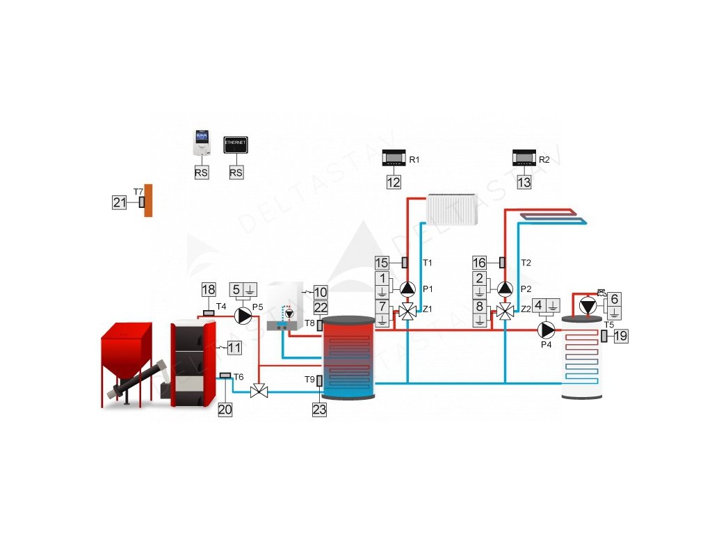 - štyri rovnako konfigurované výstupy pre vzájomné prepojenie zdrojov tepla alebo prácu výkonných prvkov na základe teploty a času (plynový kotol, elektrokotol, vykurovacia špirála, čerpadlá, ventily, akumulačná nádrž…) :