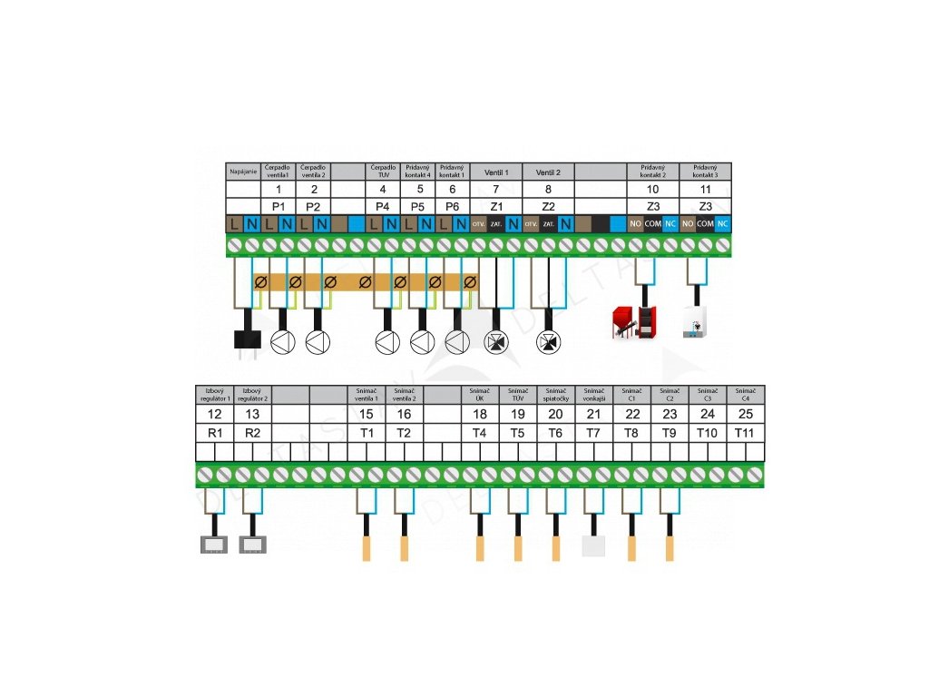 - možnosť vytvorenia dvoch priamych vykurovacích okruhov alebo ovládanie iných zariadení 230V (osvetlenie, zavlažovanie, prepínací zónový ventil a pod.