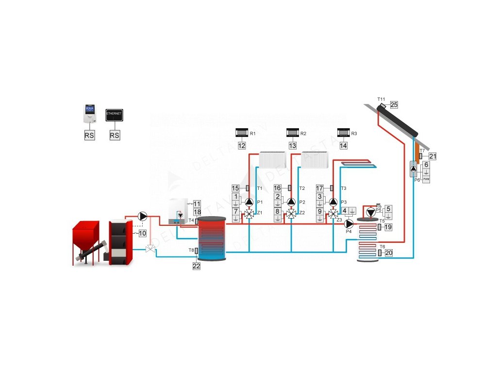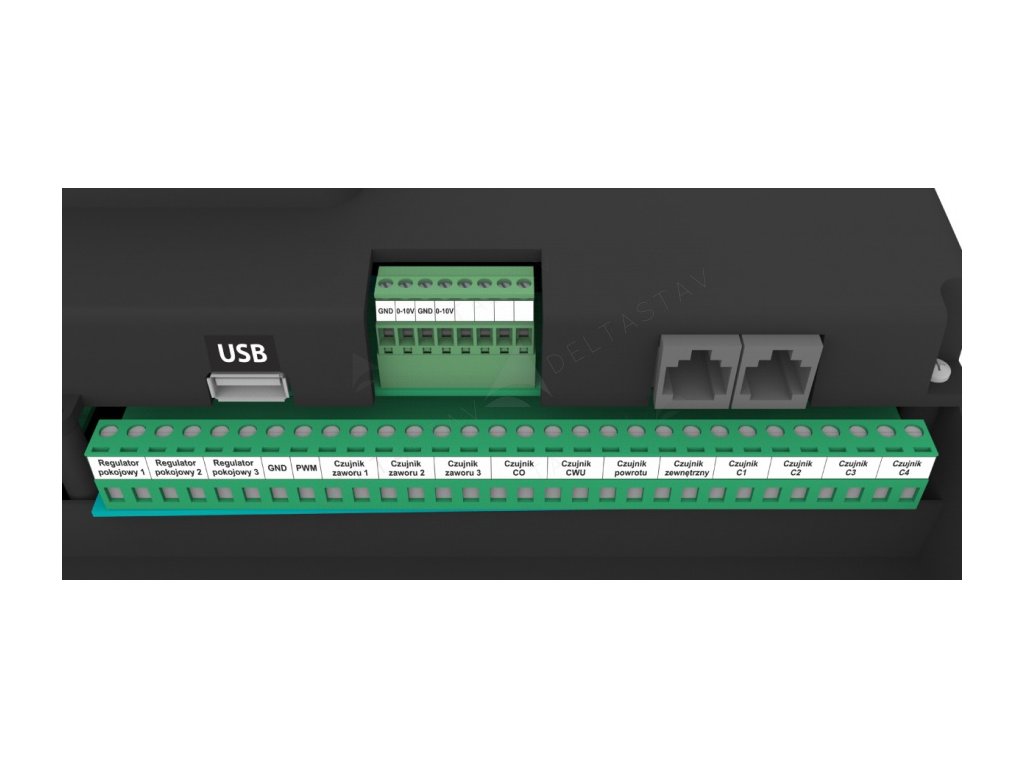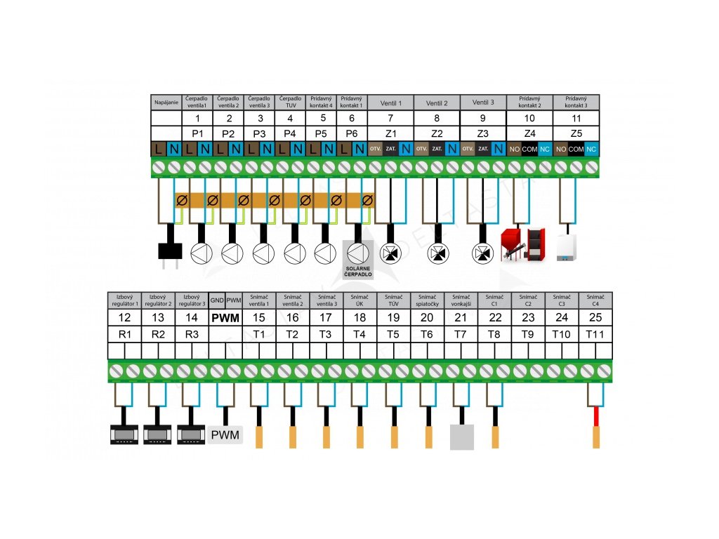- 6 snímačov teploty pre ľubovoľnú konfiguráciu snímač : teploty kolektorov (PT-1000), ekvitermický snímač (vonkajšej teploty), snímače teploty ventilov, teploty kotla, teploty spiatočky, snímač TÚV
