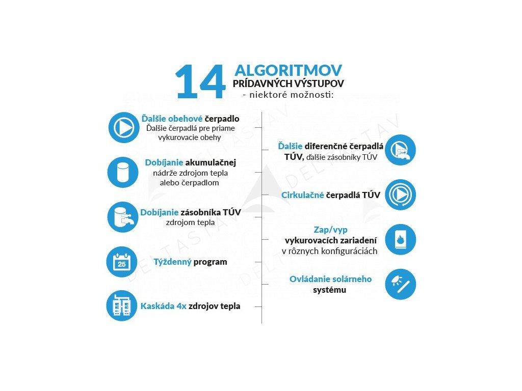 - štyri rovnako konfigurované výstupy pre vzájomné prepojenie zdrojov tepla alebo prácu výkonných prvkov na základe teploty a času (plynový kotol, elektrokotol, vykurovacia špirála, čerpadlá, ventily, akumulačná nádrž…) :