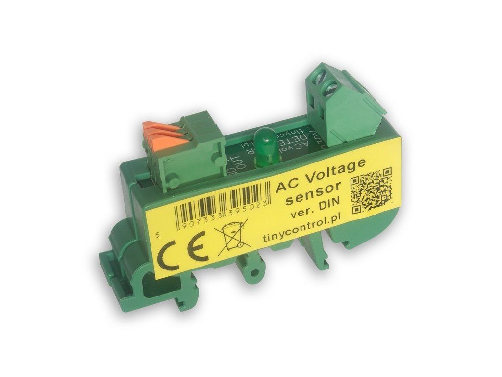 Tinycontrol AC SENSOR ver. DIN. Senzor určený k montáži do elektrického rozvaděče na DIN lištu. Jednoduchým způsobem indikuje dostupnost síťového napětí 230 V. Je obzvláště užitečný ve všech instalacích s UPS. Optická měřicí metoda zaručuje galvanické oddělení mezi napájecím napětím 230 V a informačním výstupem. Používá výstup logického typu (svorka INPD, pro připojení ke vstupu INPD/iD na tcPDU/LK). - Proudové napájení 230 V - nízký stav 0, cca 0,1 V - Žádné napájení 230 V - vysoký stav 1 cca 2,4 V Technické specifikace: Spotřeba proudu: 1 mA při AC 230 V Provozní napětí: AC 230 V Terminály: +5 V, GND, INPD Barva: zelenáDodatočné parametre