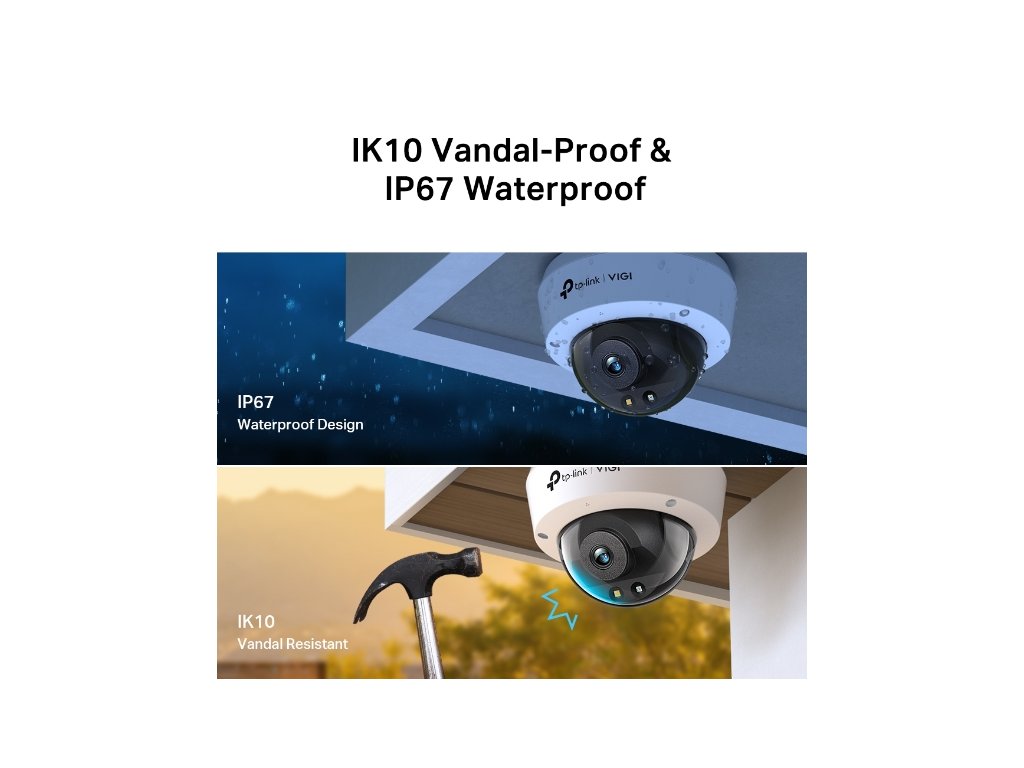 IK10 Vandal-Proof & IP67 Vodotesnosť: Táto kupolová kamera VIGI s odolným voči vandalizmu a vodotesným dizajnom je odolná voči vandalizmu a drsným prostrediam s dažďom a prachom pre stálu bezpečnosť kdekoľvek a kedykoľvek.