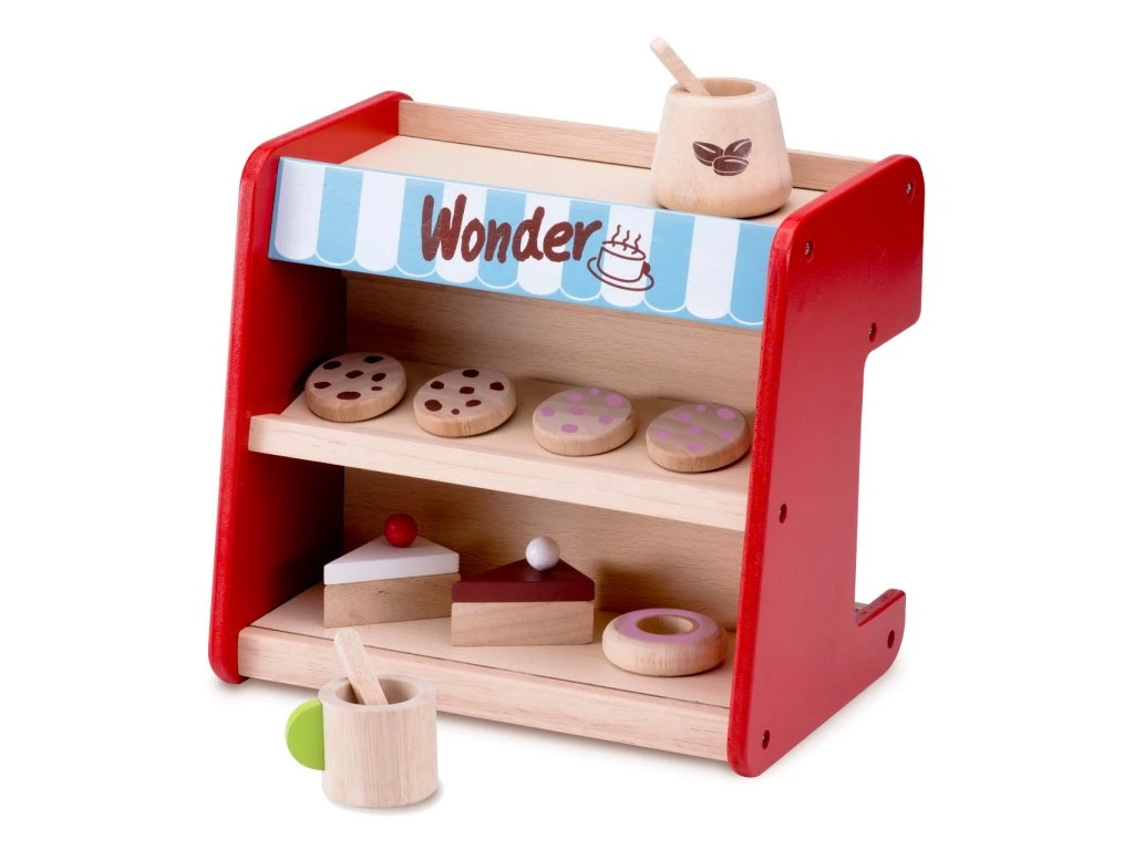 Súprava kompaktného a prenosného kávovaru pre deti, ktoré si radi hrajú na baristu, Vás prekvapí prepracovanými detailmi. Na jednej strane nájdete kávovar s odnímateľnou pákou a pohyblivým dávkovačom mlieka aj ovládací displej s otočným cvakajúcimi gombíkom a maľovanými tlačidlami. Do poličiek na druhej strane kávovaru môžete vystaviť dezerty dodávané so súpravou. Súčasťou balenia je aj ďalší riad. Sada ponúka odolné masívne prevedenie a kombinuje atraktívne sýte farby s farbou prírodného dreva. Hlavné vlastnosti:kávovar s pákou, hrnček, dóza, 2 lyžičky a 7 sladkostíobojstranná kompaktná konštrukciaodnímateľná páka, pohyblivý dávkovač mliekaotočný gombík vyludzujúci zvukvitrína s dvojicou polícDodatočné parametre