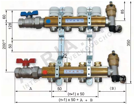 - Součástí je montáž: rozdělovač s regulačními ventily, rozdělovač s uzavíracími ventily, montážní držáky, 2 kulové kohouty s armaturami, 2 ks ukončení s automatickým odvzdušňovacím ventilem a otočným vypouštěcím ventilem